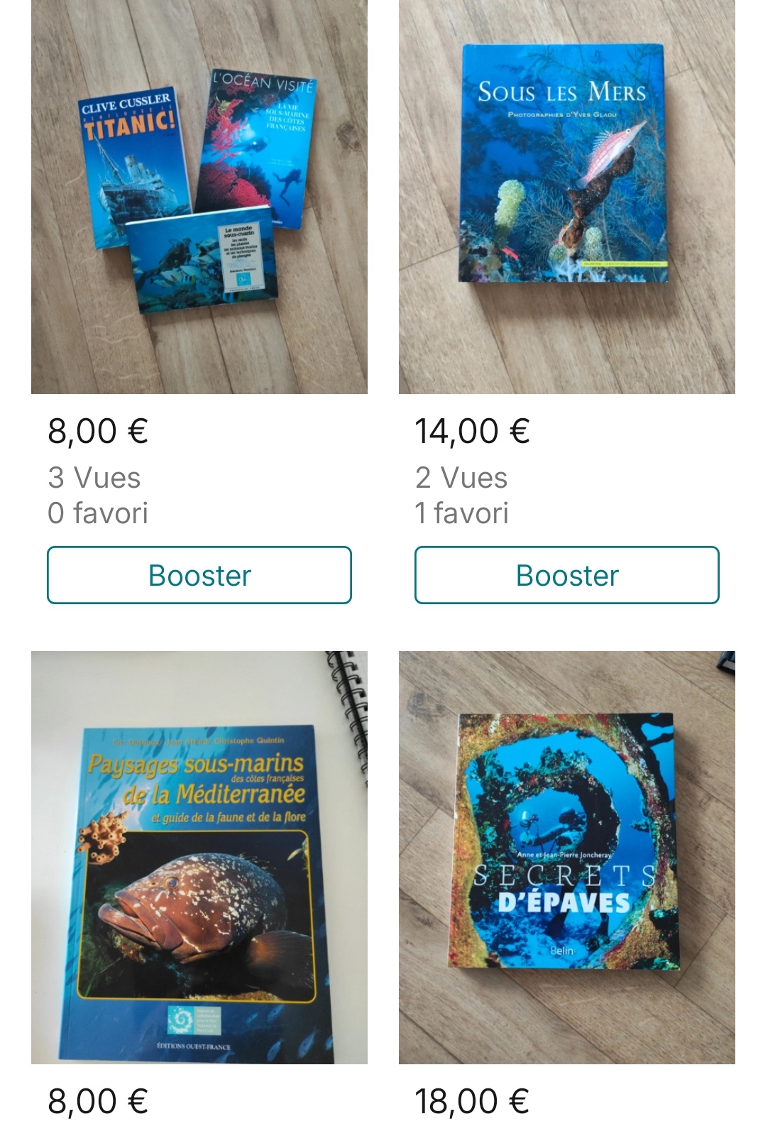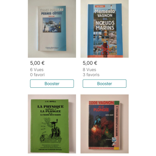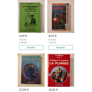 N'hésitez pas à me demander des références. Plongées plaisir, monitorat, secourisme adapté à la plongée, histoire de l'image sous marine, Cousteau .... Divers ouvrages donc divers prix. Je peux faire des lots si intéressé.